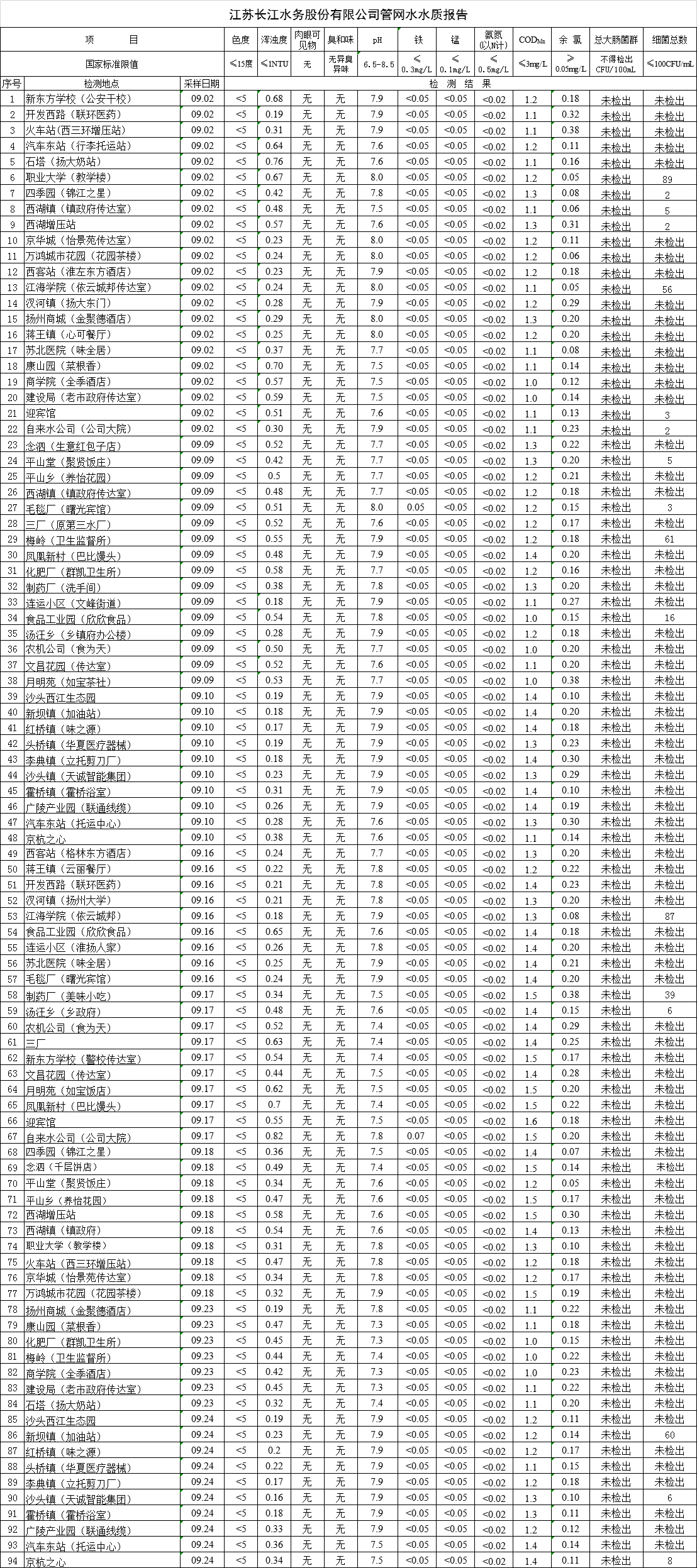 江蘇長江水務股份有限公司管網水水質報告(2019年9月)