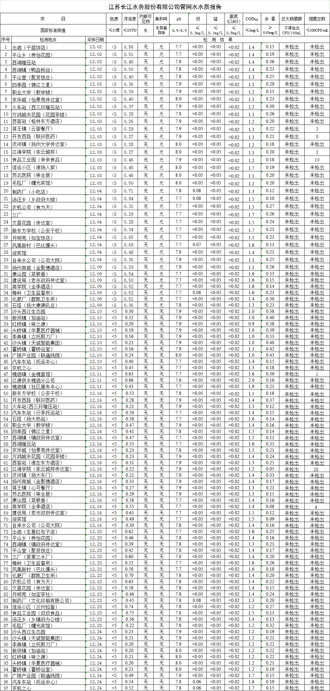 江蘇長江水務股份有限公司管網水水質報告(2019年12月)