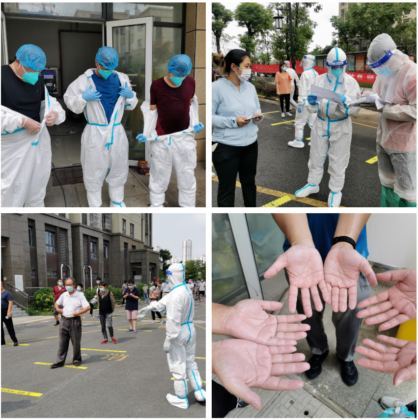 “幫我對照下防護服穿戴教學視頻,順序對不對?全部保護了沒有?”這是志愿者首次穿戴全套防護用具時忐忑的話語。初次接觸防護服,雖然前期教學培訓過,但內心期待中還有些許緊張,動作生疏卻很仔細,大家相互幫忙、相互學習、相互監督,確保不留任何漏洞,檢測過程中,大家要做好測量體溫、核對人員信息、核查健康碼、提醒保持安全距離、幫助老弱病殘及特殊人群等工作,有時還要應對暈厥的居民、易怒的群眾情緒以及少部分特殊群體的交流障礙,一次核酸檢測的時間大概在3小時左右,這樣高強度的工作環境,大家沒有任何怨言,除去防護服的那一刻,看著臉上深深的勒痕、滴水的上衣和發白的雙手,有的只是相視一笑,再次投身到小區封控管理工作中去。
